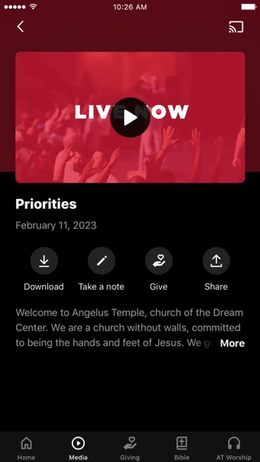 This app will help you stay connected with the day-to-day life of our church. With this app you can: watch or listen to past messages; stay up to date with push notifications; share your favorite messages via Twitter, Facebook, or email; and download messages for offline listening.