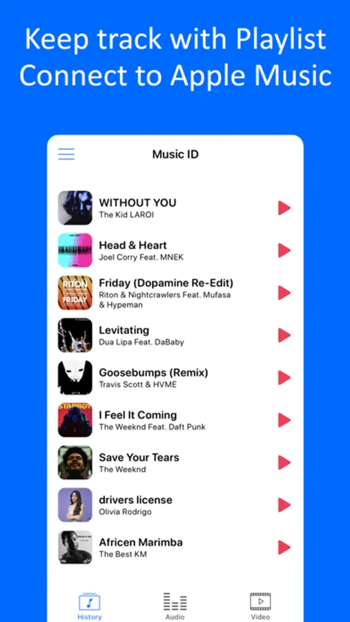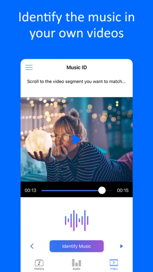 - Video identification: import any video from your gallery, select the video segment and tap 'Identify' and the app will tell you what song is in the background