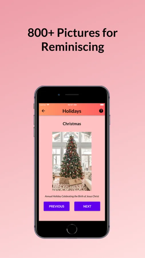 The Pictures Module of the AlzBuddy app includes a selection of over 800 pictures with descriptions. Images available include famous world figures (world leaders, athletes, musicians, and more) from 1950-1990, common animals, household objects, sports, holidays, elements of nature, and more. These images are aimed at helping the user remember and reminisce about key figures and items throughout their lives.
