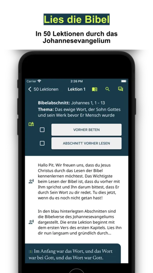 Außerdem sind Hinweise und Links zu weiterführenden Gedanken und tiefergehenden Auslegungen des Textes integriert. Das Hauptanliegen der App ist es, den Leser mit der Person des Herrn Jesus, des Sohnes Gottes, der Mensch wurde bekannt zu machen und so den Heiland der Welt vor die Herzen zu stellen.