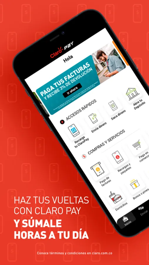 Claro Pay es la billetera móvil que te permite hacer pagos, compras y recargas desde tu celular. Úsala para invertir, ahorrar, recibir dinero y hacer uso del mismo.