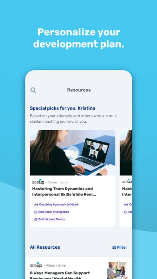 The AceUp app allows you to interact on a real-time basis with your coach, stay on track throughout your coaching journey, and access industry-leading resources to further accelerate your individual development and performance.