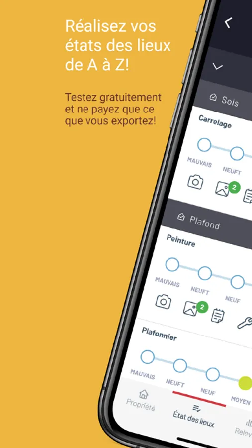 Parce que l’essayer c’est l’adopter, téléchargez gratuitement l’application et testez toutes les fonctionnalités sans restriction ! L’achat de votre premier crédit pour exporter votre état des lieux ne vous sera demandé qu’à la toute fin, si vous êtes convaincu et que vous souhaitez recevoir votre rapport final!