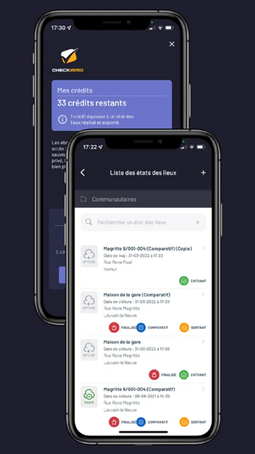 Check-immo a été pensé et créé afin de réaliser tous vos états des lieux de A à Z très simplement. De l’analyse de l’état du bien avec notes et photos, en passant par le relevé des compteurs, la signature des différentes parties présentes et l’export du rapport final à envoyer par email, l’application couvre l’ensemble des points à traiter lors d’un état des lieux.