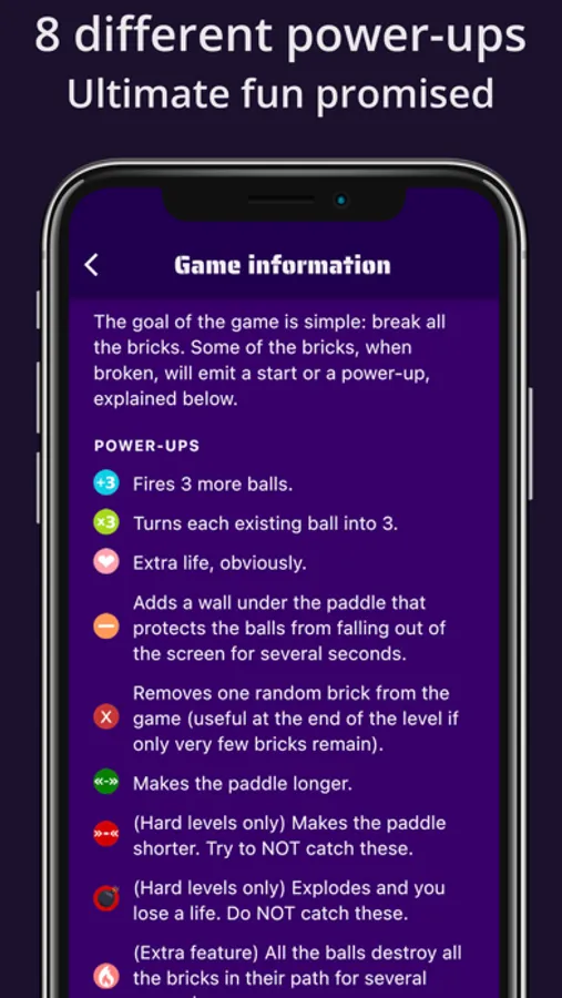 - 8 power-ups including x3, +3, wall, x (remove 1 brick), heart, laser, fireball and bar extension.