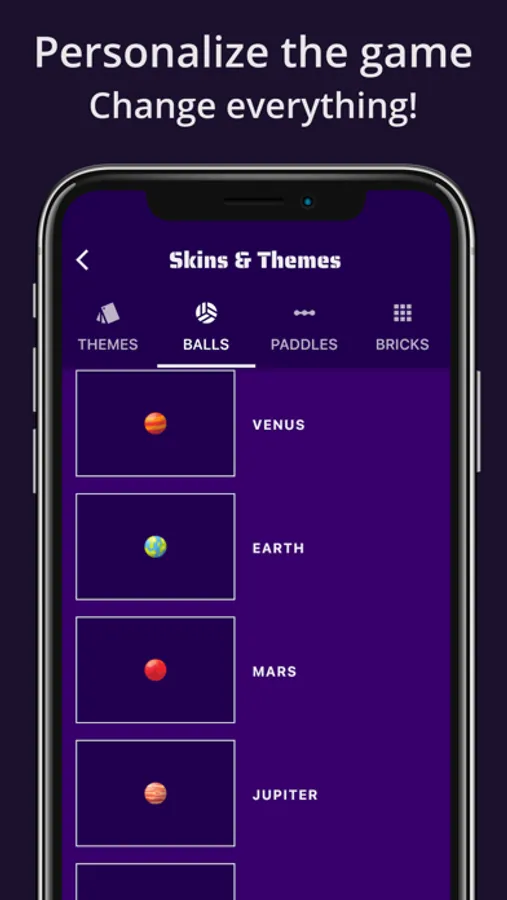 In total there are 20+ themes as well as 50+ skins for balls, paddles and bricks, with which you can creatively adjust the appearance of the game to your preference. For example, some of the popular themes are Starry Night, Merry Christmas, and Love and you can change the balls to be basketball, football, golf ball or even planets. The shape, color, and pattern of the bars and bricks can also be modified.