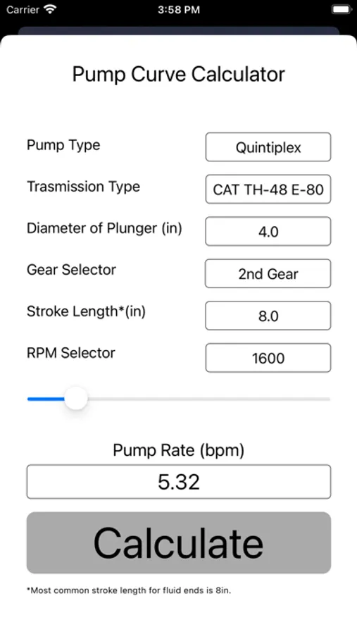 Additionally, RPM calculator was designed to be as user friendly possible to ensure the augers are spinning at the correct speed during pumping to avoid any undershoot or overshoot of target. Sliders and steppers are included to ease the process of inputting the paramters. Hydrostatic calculator is designed to be abel to calculate proppant-laden slurry hydrostatic in the wellbore which is important so that the expected surface pressure drop when pumping high proppant concentrations can be calculated due to corresponding increase in hydrostatic pressure. Unit converter for most commonly used oilfield units is also included. You can also determine exactly what your exact pump rates calculated from pump rate curves that are based of Allison and Caterpillar transmission.