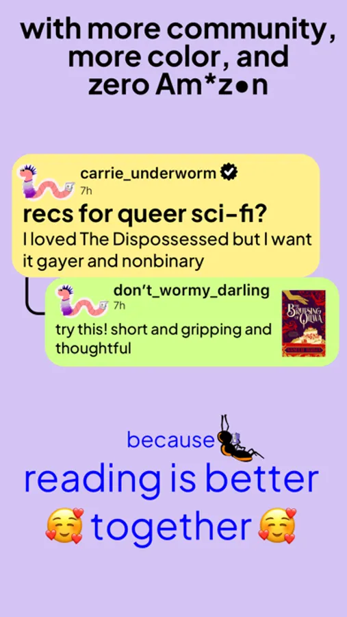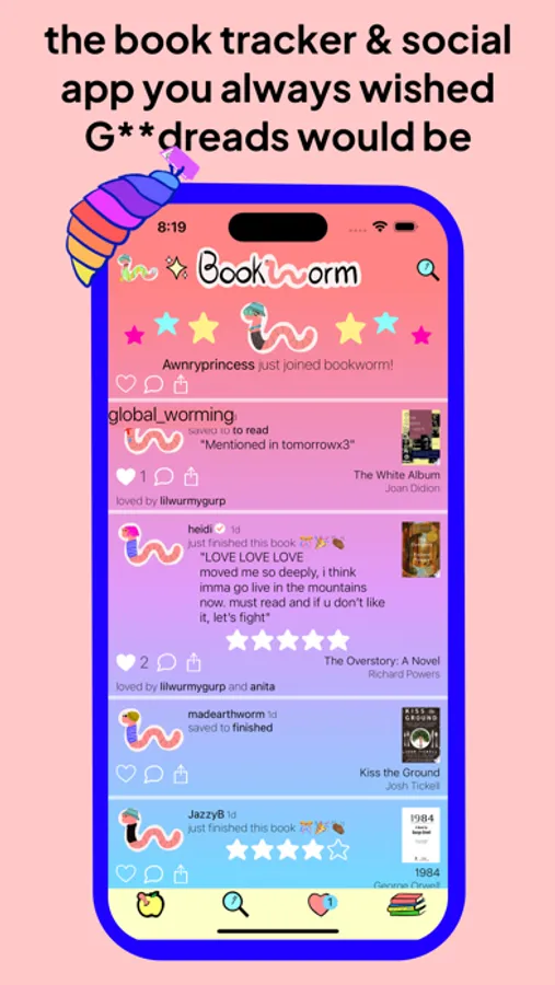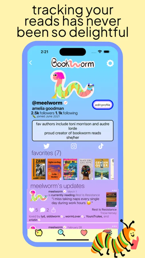 Social sharing included. Share books to your instagram story with pre-made, gorgeous backgrounds. You can tweet, text, email, or whatever kind of sharing you'd like with everything on Bookworm. From books, to posts, to your wormy's outfit, share on whatever platform is your favorite.