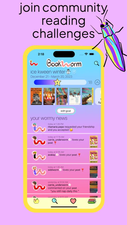 Join community reading challenges. Set a reading goal for yourself and let your friends cheer you on. The number of books you set as your goal is only visible to you. Upon joining, you get the option to give your wormy a badge to show you're participating in the community challenge. And if you can edit your goal number as the challenge continues.