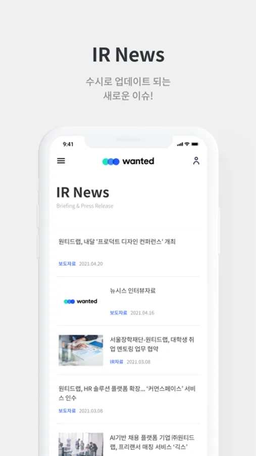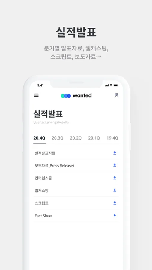 이앱은 원티드랩의 IR정보를 제공하는 Application으로 IR일정, 분기별 실적발표자료, 다양한 IR News, 주요 경영보고서, 재무정보, 공시, IR담당자 Contact 정보 등 최신 IR정보를 제공합니다.