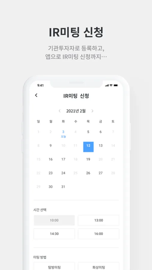 - 기관투자자로 가입하신 회원은 “IR 미팅 신청” 기능을 통해 편리하게 접수하실 수 있습니다.