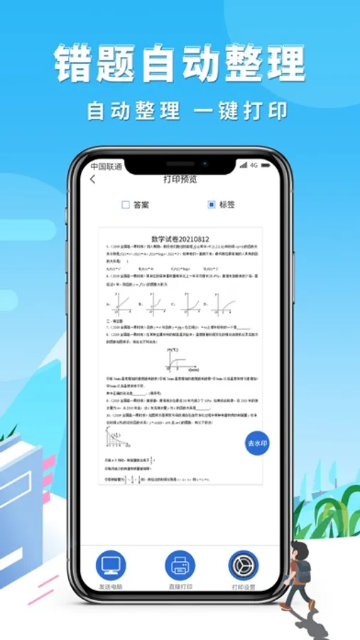 【分享和打印】将选中的错题快速组卷,并自动排版成Word,pdf 。 可分享到QQ和微信,也可直连打印机打印将选中的试卷,自动导出 pdf ,供打印。