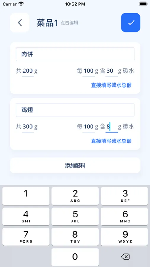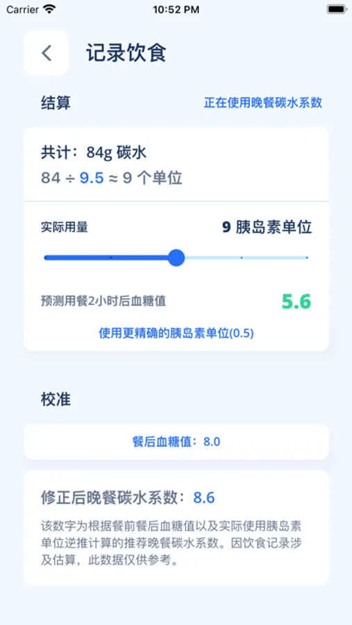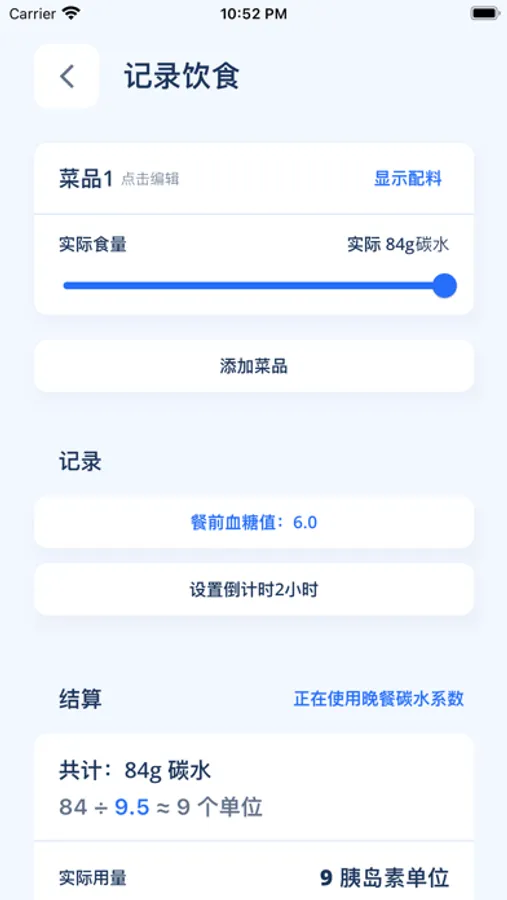 输入食物以及碳水量,计算碳水总和以及推荐胰岛素使用量