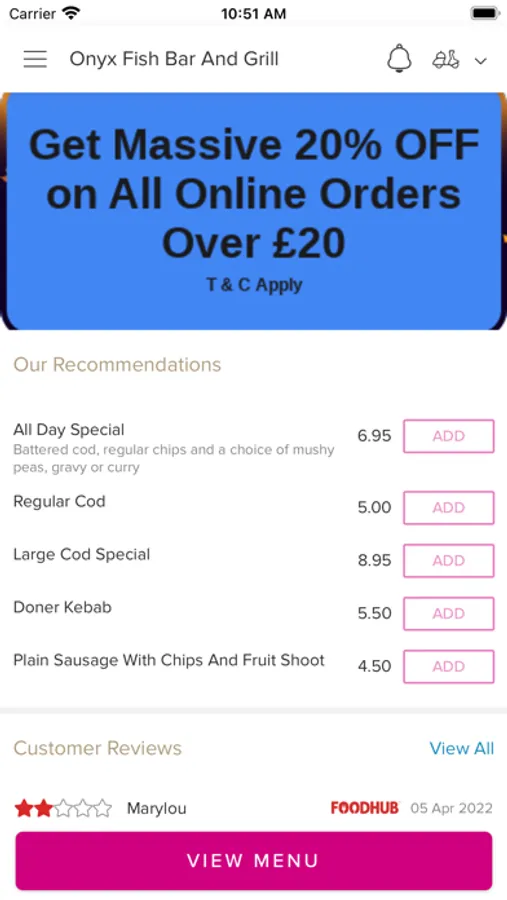 Here at Onyx Fish Bar And Grill, we are constantly striving to improve our service and quality in order to give our customers the very best experience. As a result, we are finally proud to unveil and introduce our latest improvement, our new online ordering app! You can now relax at home and order your favourite, freshly prepared meals from Onyx Fish Bar And Grill. You can even pay online!