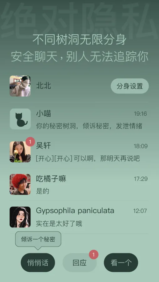 在树洞喵里,每个树洞可以开启你的不同分身,每个分身都可以修改名字和头像,没人知道你是谁,别人也无法追踪你,让彼此安全放心的倾诉、聊天和结交新朋友。