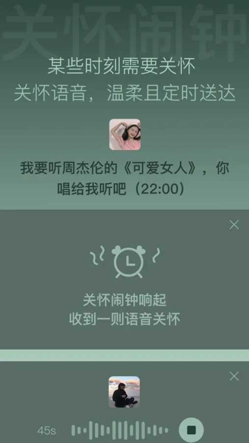 「关怀闹钟」开启关怀闹钟,在你需要关怀的那些时刻,能接收到其他人温柔的真人关怀语音。
