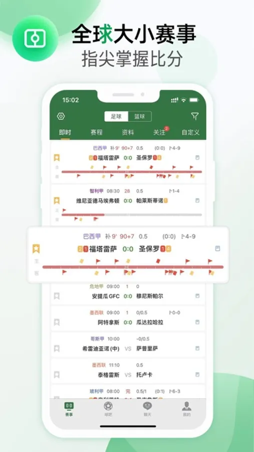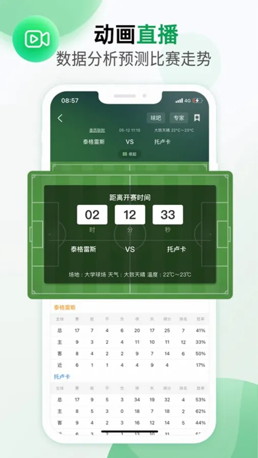 实时赛况:查看足球/篮球比赛的实时赛况,通过APP提供的动画直播、比赛进程等功能,让用户时刻掌握比赛双方的攻守状态,鉴于无暇查看比赛赛况的用户,APP的关注功能可帮助用户实时接收比赛的开始、半场、完场、进球等关键状态通知;