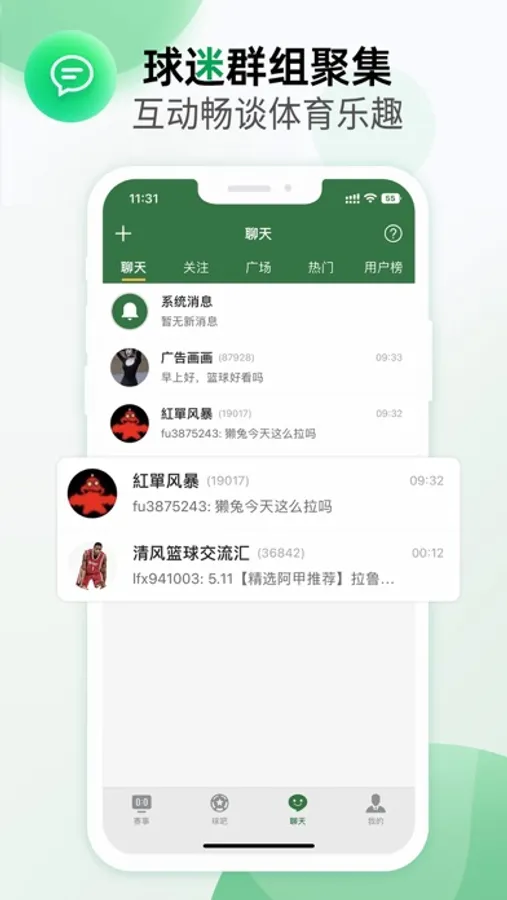 球迷聊天:用户自发性建立兴趣群聊,邀请兴趣相投的球迷朋友进群,共同讨论比赛、球员、技战术、周边等一切话题,更可在队伍比赛时通过语音信息为队伍呐喊助威,活跃群内气氛;