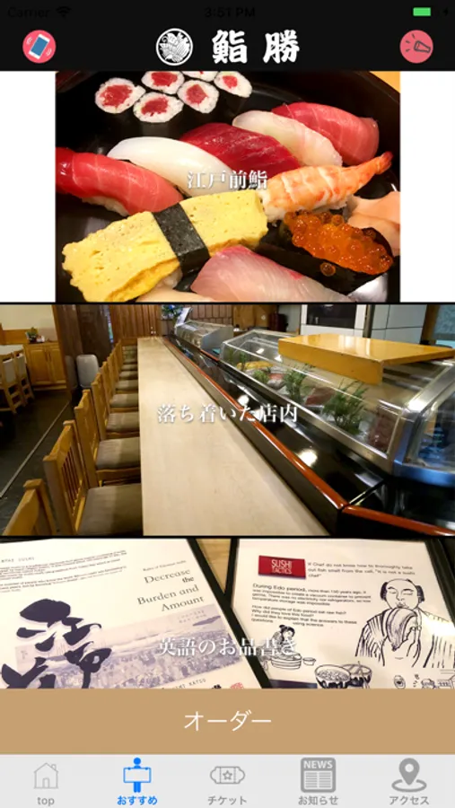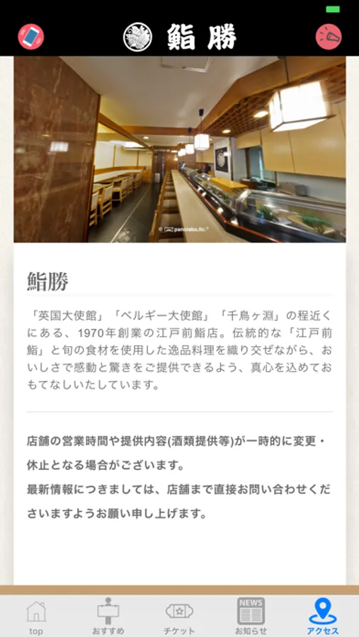 鮨勝アプリは、東京都千代田区にある江戸前鮨店「鮨勝(すしかつ)」の公式アプリです。