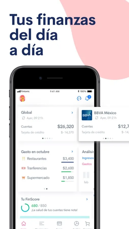 Fintonic es una app de finanzas personales que te ayuda a organizar tu dinero y a ahorrar. Organiza el dinero de todos tus bancos y tarjetas en un mismo lugar; vas a saber cuánto gastas en el súper, en deportes, en viajes, etc.