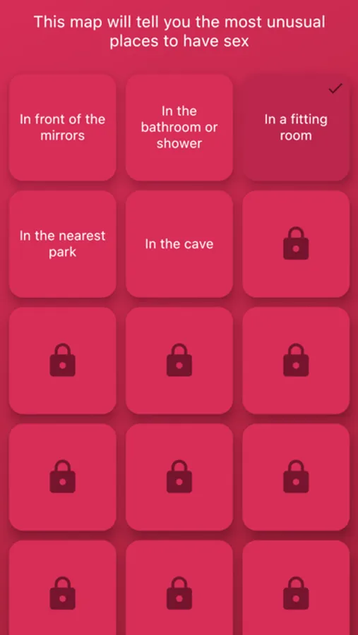 Or maybe you want to try new places for sex and don't know where? My game will tell you 45 new places for sex, choose any and mark those that you have already tried.
