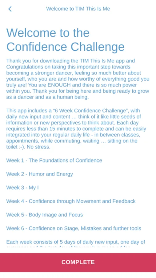 TIM - This Is Me Confidence App and programs is your tool for building your self confidence as a dancer and as a human being. The app includes: