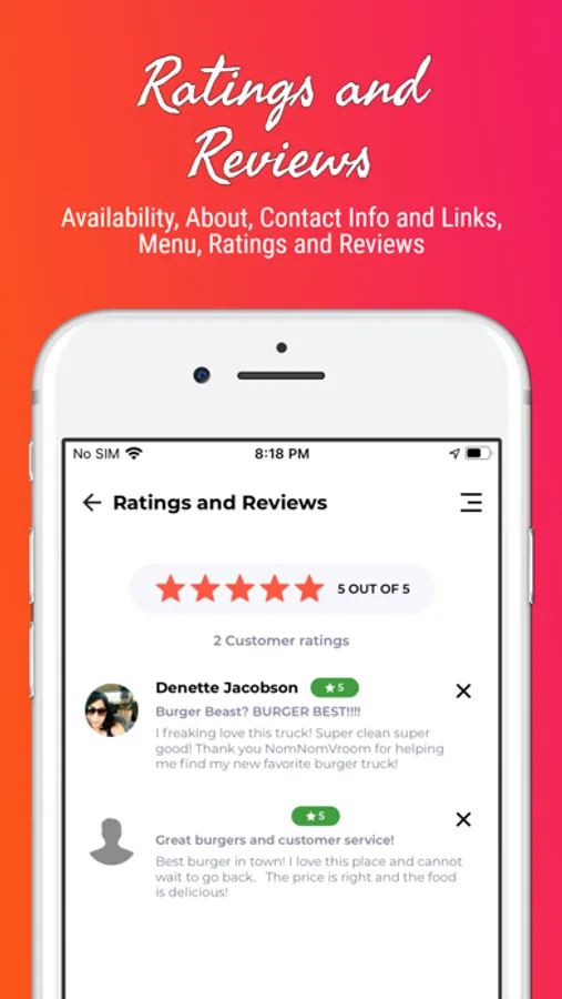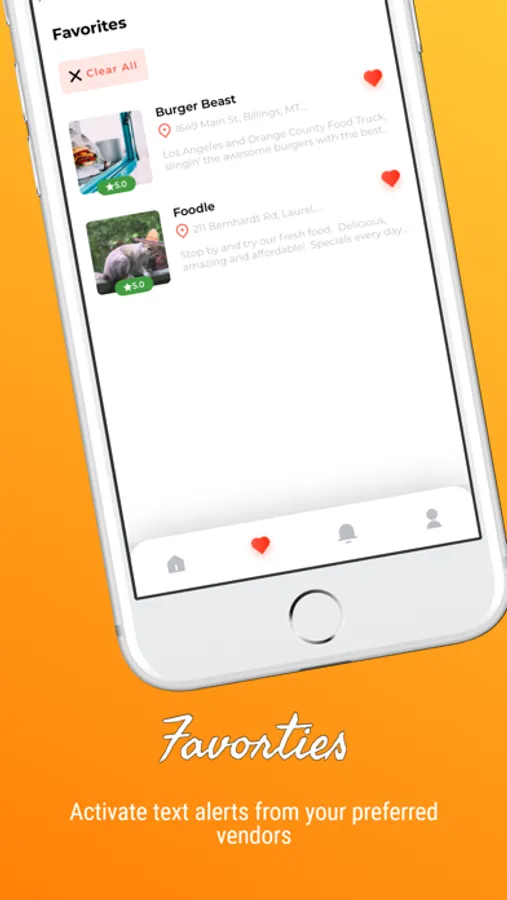 ◉ Text Alerts: Vendors, send text alerts to the customers who have favorited your business. Let them know about specials, SOLD OUT, or if you have to leave your location early. Customers, favorite businesses to start receiving text notifications.