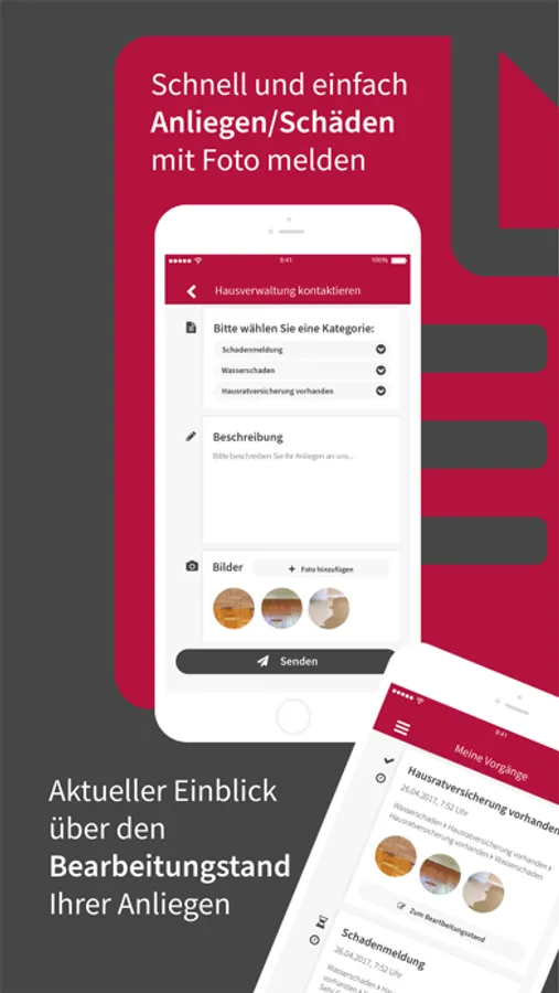 Als Mieter oder Eigentümer können Sie Schäden oder Anliegen direkt mit Fotos über unsere App melden. Ihre Anfragen stehen unseren Mitarbeiten dann zur Verfügung und können auch an Handwerksbetriebe weitergeleitet werden.