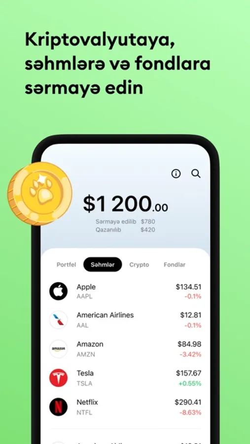 - səhmlər (Apple, Google, Tesla, Amazon və s.);