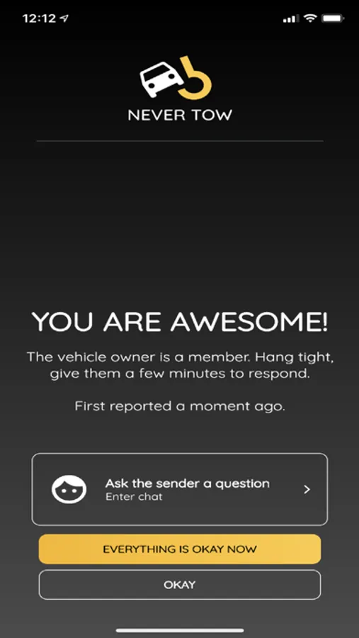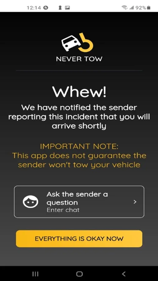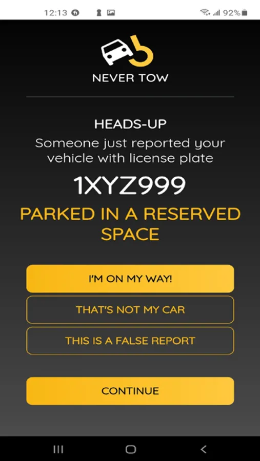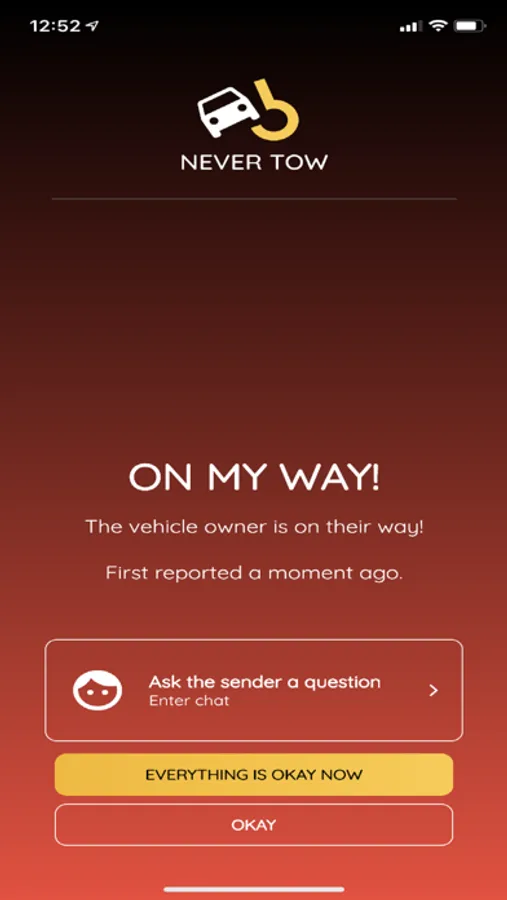 How does it work? Private patrol companies, apartment managers, HOA board members, or anyone that discovers your car is violating a parking policy can simply open the Never Tow app, aim the camera at your license plate, and you are immediately notified that someone is planning to tow your car away. With one touch you can reply with “I’m on my way!” or ask questions.