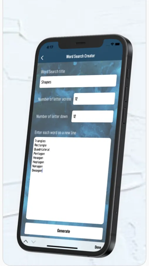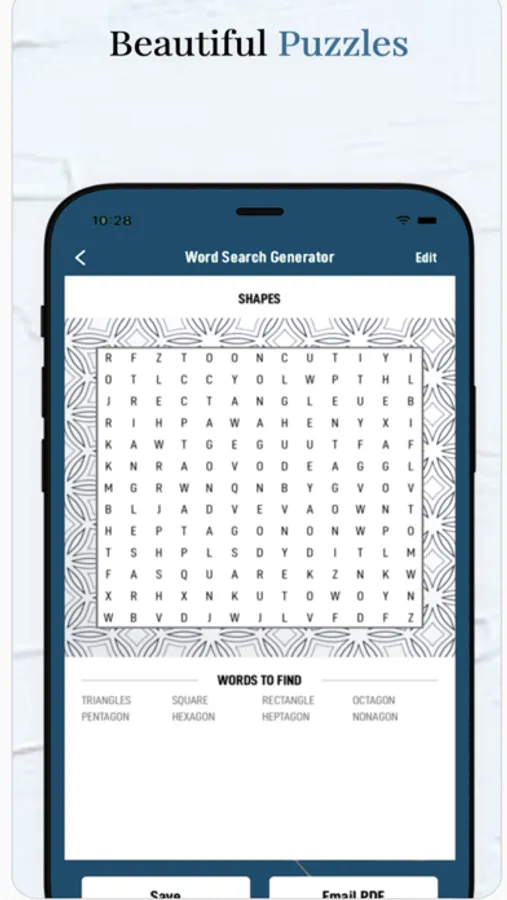 The WordSearch Generator has an easy to use interface, highly intuitive. The app allows you to create beautifully designed and custom made Word Search Puzzles which can be saved on your device and can be edited on a different date to be adapted for a new audience.