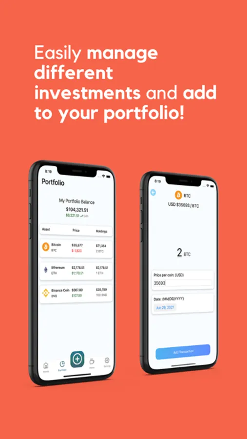 Manage and track your investments and transacted crypto. Add any cryptocurrency that you have transacted and add them to your portfolio! View your profits from your portfolio and the number of coins you have in your portfolio!