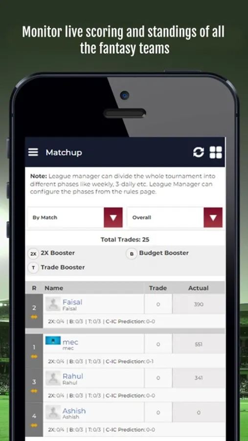 Watch your fantasy team score points every minute! Keep track of your team’s performance as per the LIVE MATCH and cheer them as they score points for your fantasy team! Keep track of your team scores that are updated real-time (every 30 seconds) every match.