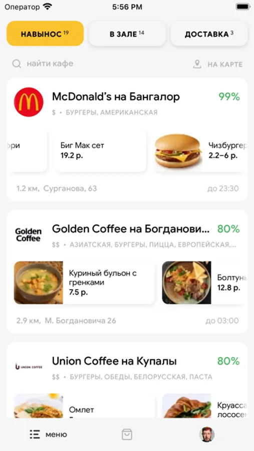 Приложение с актуальным меню кафе и фастфудов Минска, заказ еды навынос или на месте
