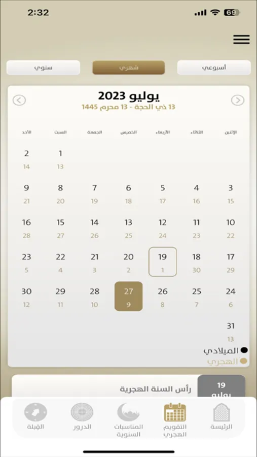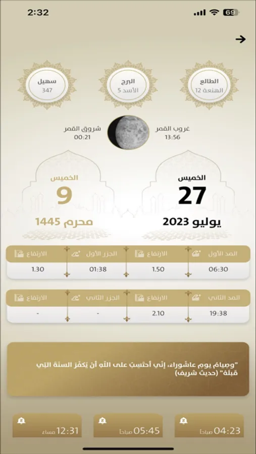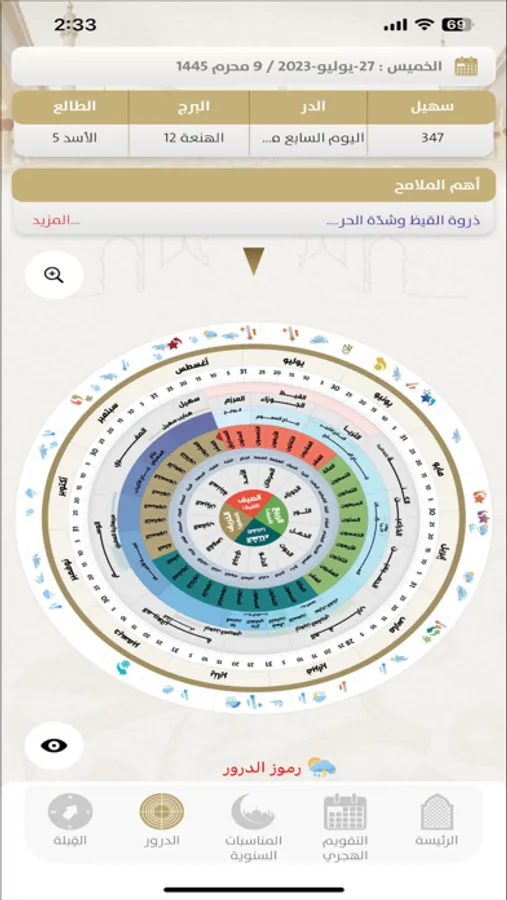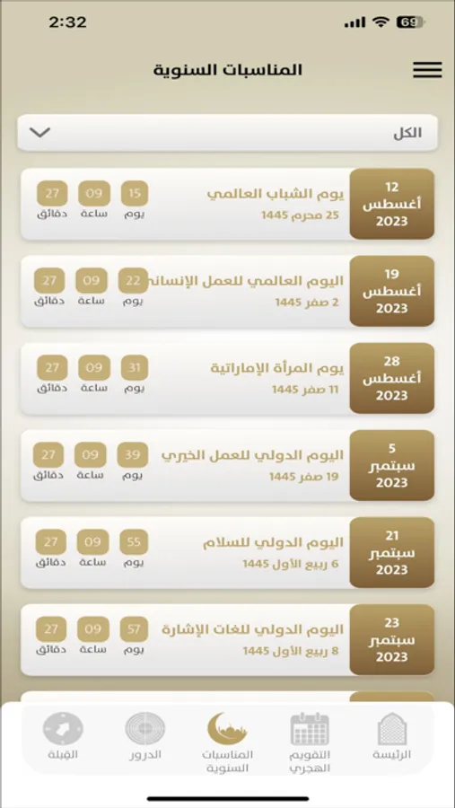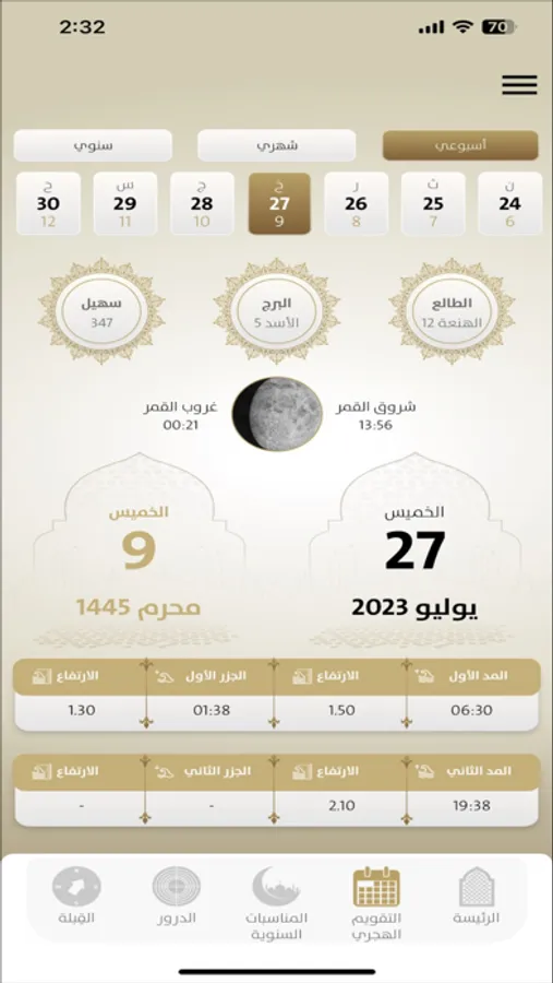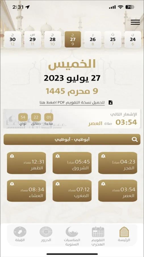 نضع بين أيديكم تطبيق التقويم الهجري التفاعلي، والذي يشمل كل ما تحويه (الروزنامة الورقية) من أجندة ومعلومات إضافية وخصائص فريدة في قالب تقني فريد سهل الاستخدام. ويُمكِنكم من خلال التطبيق التعرف على مواقيت الصلاة والبروج والدُّرور والطّوالع والمواسم، والمناسبات السنوية، وحركة المد والجزر، ليشمل بذلك كل ما تحتاجون إليه. ويتميز التطبيق بسهولة إتاحته معرفة مواقيت الصلاة لجميع مدن ومناطق دولة الإمارات العربية المتحدة كلٌ على حِدَة، من خلال الضغط على الإعدادات، واختيار المدينة التي ترغب بمعرفة مواقيت الصلاة فيها.