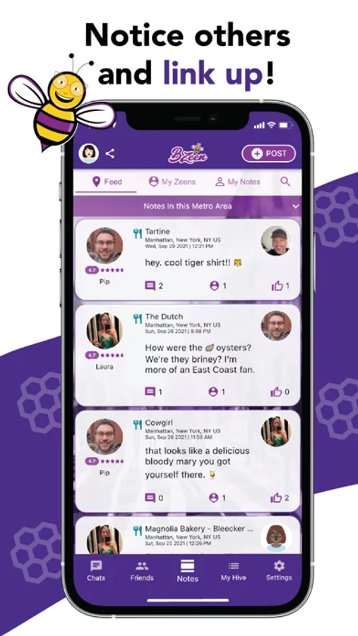 Getting involved in the BZeen network is simple! To start, post a Note describing a person you noticed nearby in real life. Include whatever made them stand out to you so that BZeen can find their profile and alert them that they’ve been “Zeen”!