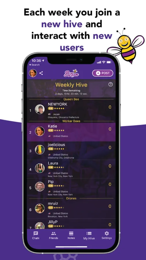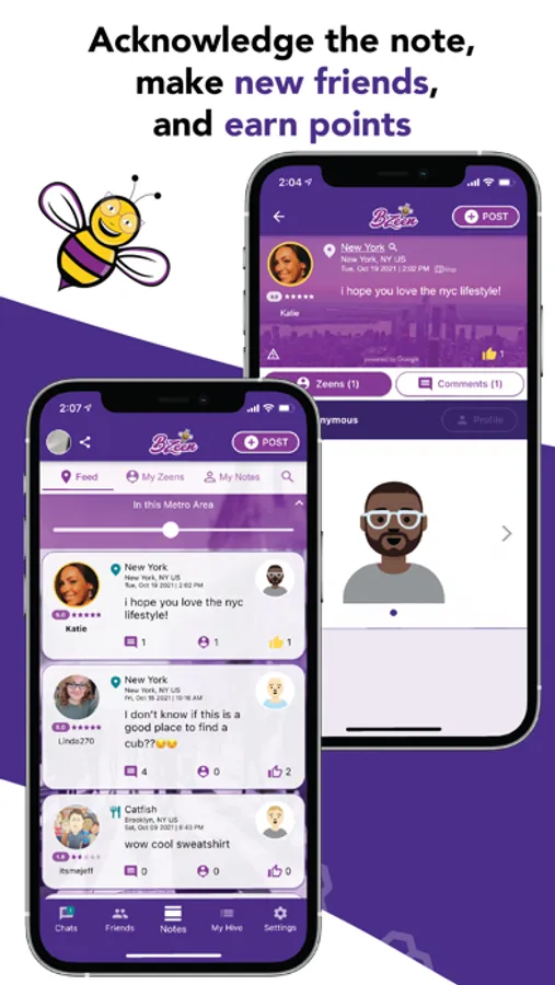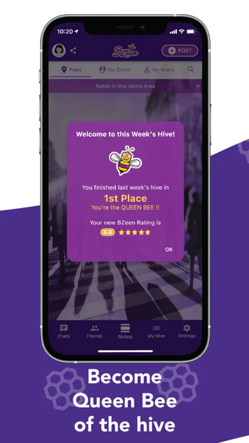Points can be earned for different actions such as when you are “Zeen”, post a Note resulting in a Zeen, receive comments or “Acks” on your Notes, or when your Notes or comments are liked. Plus, when you’re Zeen and you Ack back to a Note, you receive the mutual benefit of sharing any points that Note receives! At the end of the week your standing in the Hive is calculated into your overall BZeen rating. And the more you participate, the better chance you have of earning enough points to become Queen of the Hive.