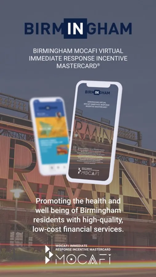 The Birmingham MoCaFi Digital Immediate Response Incentive Mastercard is issued by Sunrise Banks N.A., Member FDIC, pursuant to a license from Mastercard International Incorporated. The card may be used everywhere Debit Mastercard is accepted. Mastercard is a registered trademark, and the circles design is a trademark of Mastercard International Incorporated. Use of this card constitutes acceptance of the terms and conditions stated in the Account Agreement.