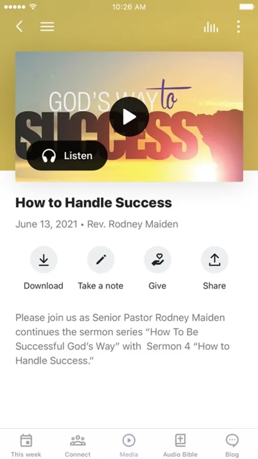 This app will help you stay connected with the day-to-day life of our church. With this app you can: watch or listen to past messages; stay up to date with push notifications; share your favorite messages via Twitter, Facebook, or email; and download messages for offline listening.