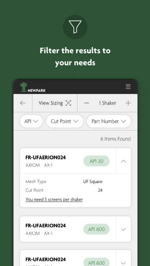 - It will provide screen options by API or Cut Point for the shaker model you select and let you know how many screens you need based on the number of shakers you input.