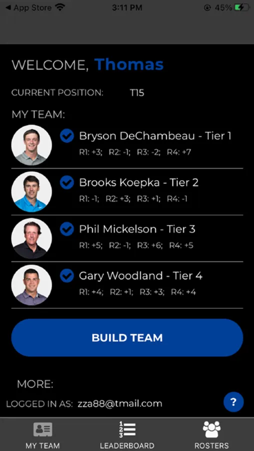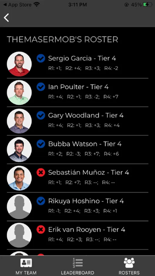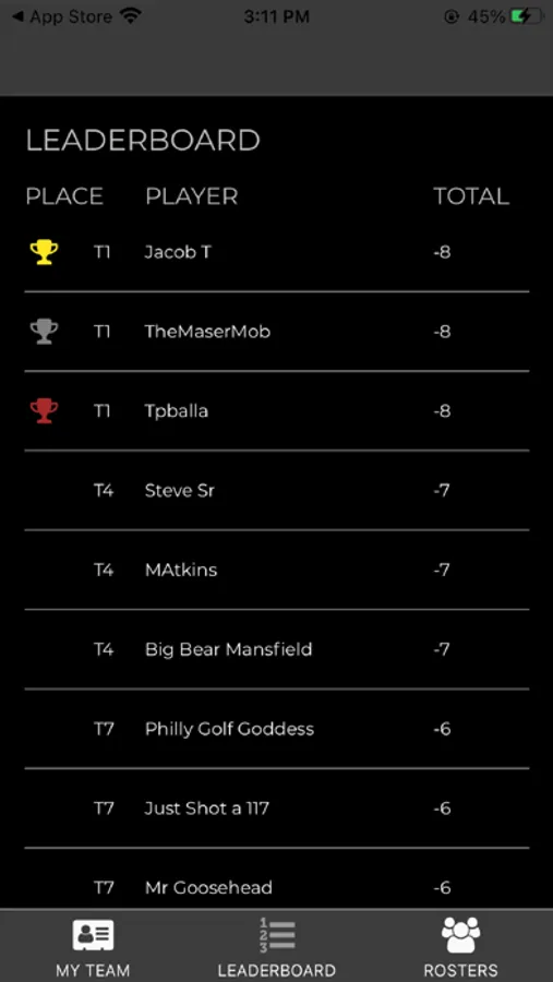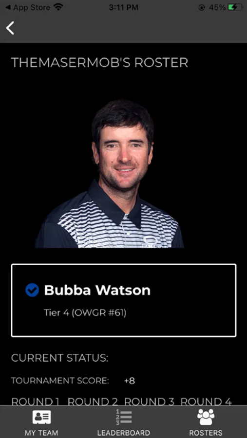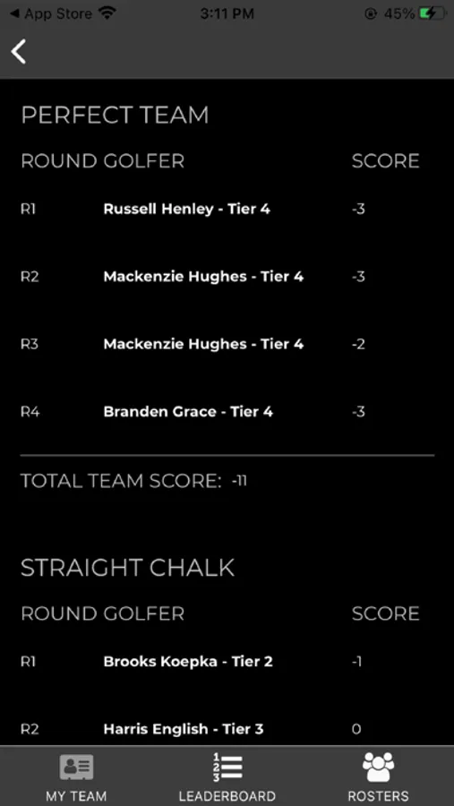 Our app provides a glimpse into additional stats and information. See golfers' scores, the perfect team, and keep track of your opponents on the leaderboard.