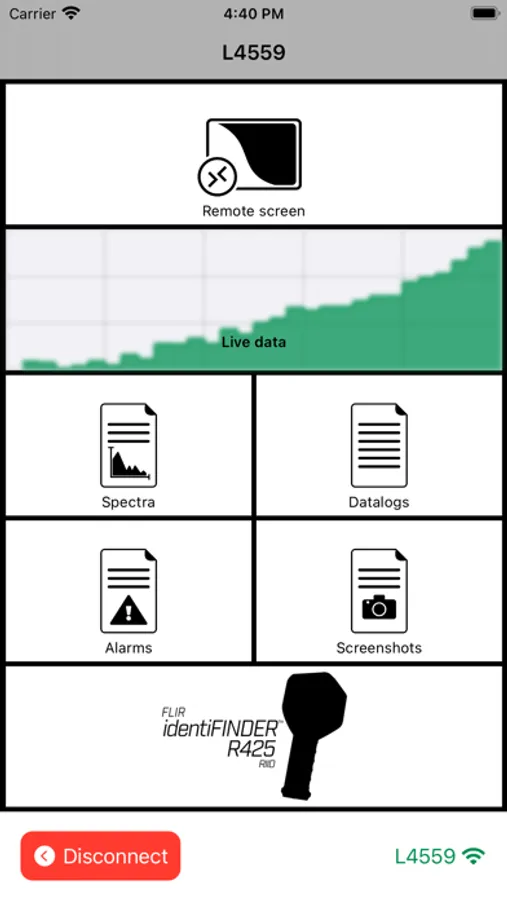 Connect with your FLIR identiFINDER radiation instruments. View live data, control the instrument remotely, and download measurements. Supports the R425 and R200 radiation detectors.
