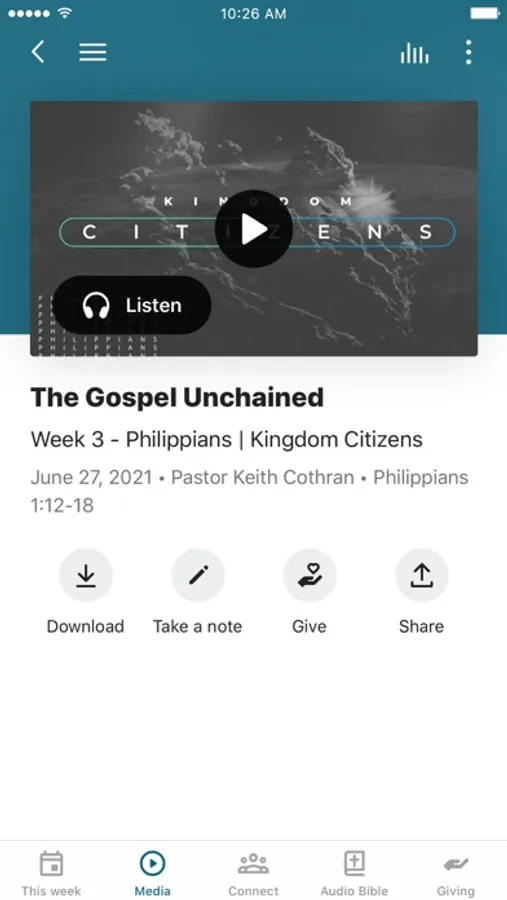This app will help you stay connected with the day-to-day life of our church. With this app you can: watch or listen to past messages; stay up to date with push notifications; share your favorite messages via Twitter, Facebook, or email; and download messages for offline listening.
