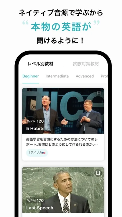 シャドテンには、1,000以上の教材があります。著名人のスピーチなどのネイティブ音源は、ビジネスの現場で実際にビジネス英語をリスニングできるようになるための教材です。さらに、TOEIC®や英検®など、資格試験の対策向けの教材も豊富で、あなたの目的やレベルに必ず合う幅広いジャンルの教材が揃っています。