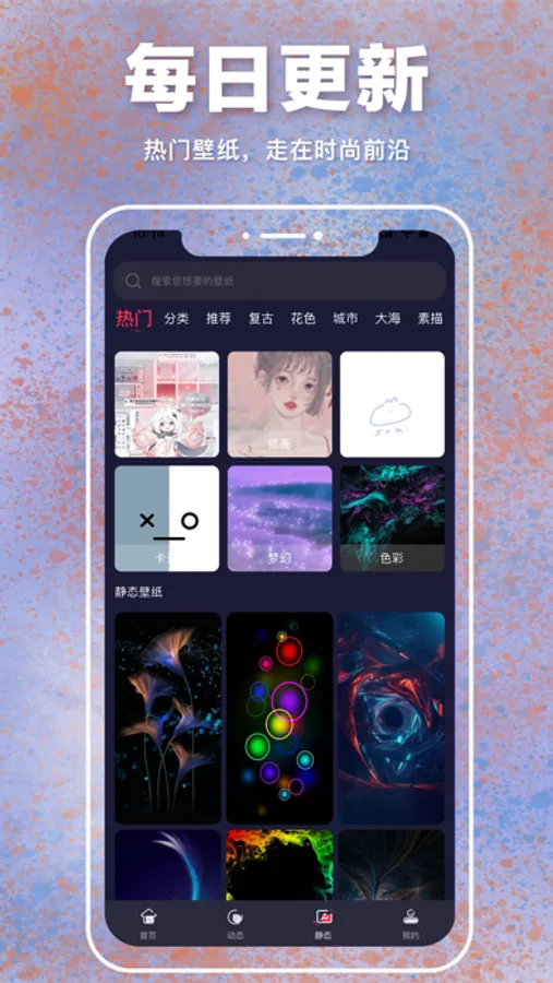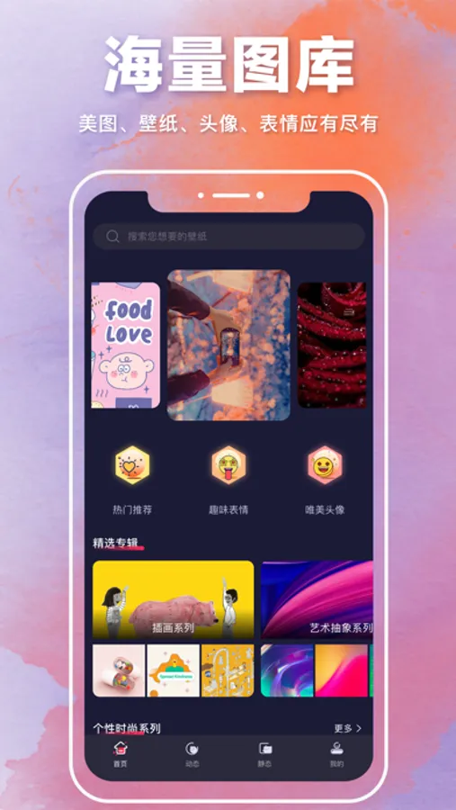 1、动态壁纸、高清壁纸、头像、主题美化、背景图、名片、心情图,只要你想要的,这里都有