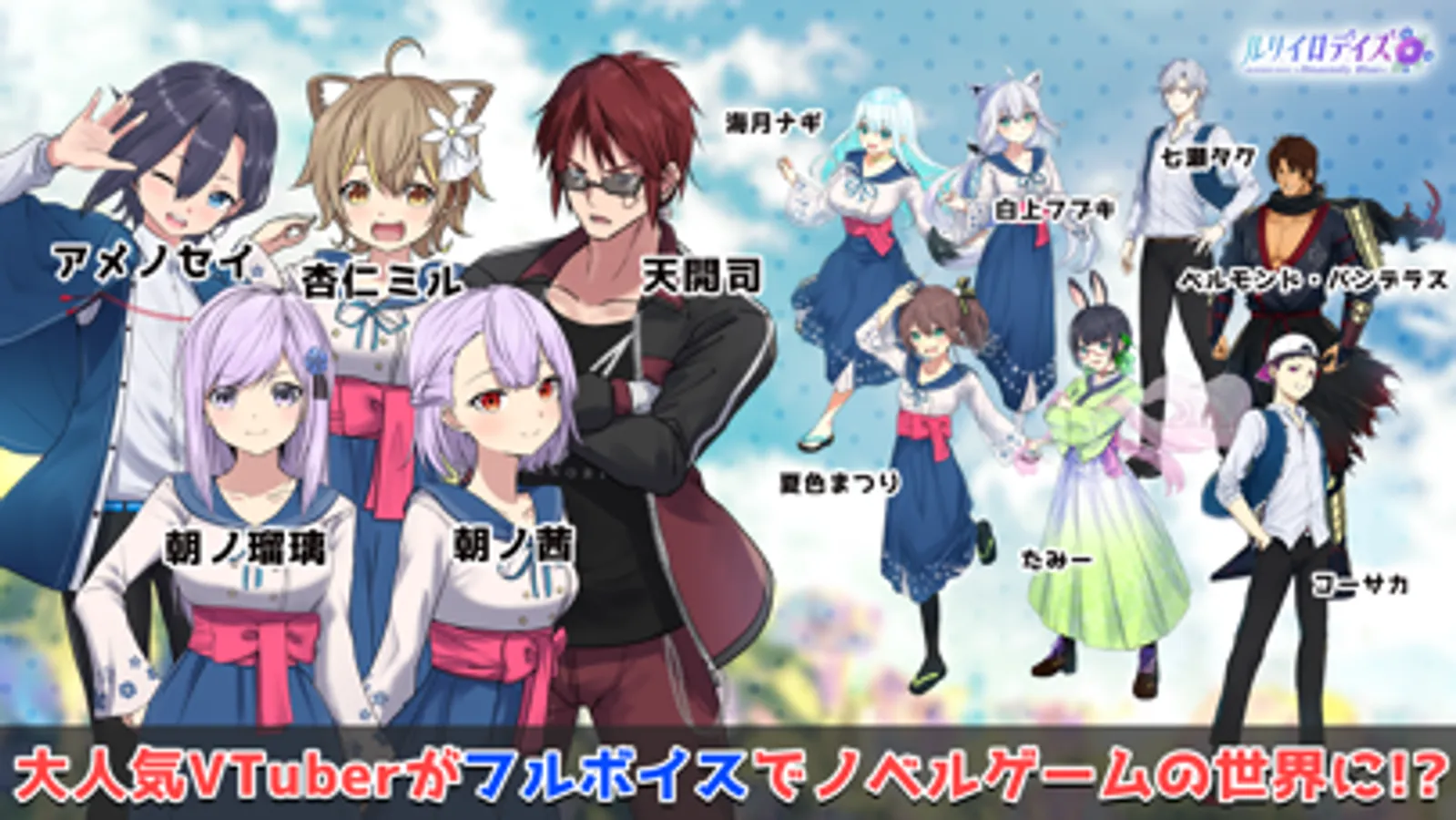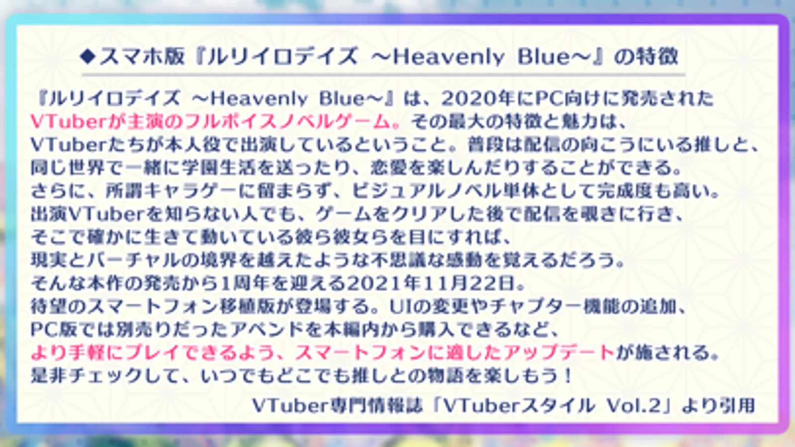 『ルリイロデイズ ~Heavenly Blue~』は、2020年にWindowsPC向けに発売されたVTuberが主 演のフルボイス・ノベルゲーム。その最大の特徴と魅力は、何と言ってもVTuberたちが本人役で出演しているということ。普段は配信の向こうにいる推しと、同じ世界で一緒に学園生活を送ったり、恋愛を楽しんだりすることができる。さらに、所謂キャラゲーに留まらず、ビジュアルノベル単体として完成度が高いことも大きい。出演VTuberを知らない人でも、ゲームをクリアした後で配信を覗きに行き、そこで確かに生きて動いている彼ら彼女らを目にすれば、現実とバーチャルの境界を越えたような不思議な感動を覚えるだろう。そんな本作の発売から1周年を迎える2021年11月22日、待望のスマートフォン移植版が登場する。UIの変更やチャプター機能の追加、PC版では別売りだったアペンドを本編内から購入できるなど、より手軽にプレイできるよう、スマートフォンに適したアップデートが施される。是非チェックして、いつでもどこでも推しとの物語を楽 しもう!