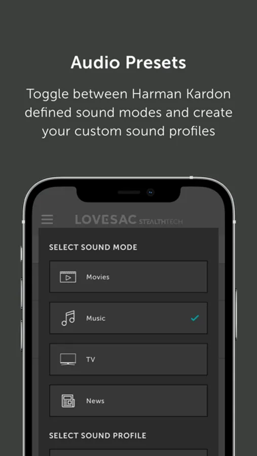 Choose from Harman Kardon defined tuning presets to pair with Movie, Music, TV, or News. Plus, adjust sound properties on your own to create and save custom presets.