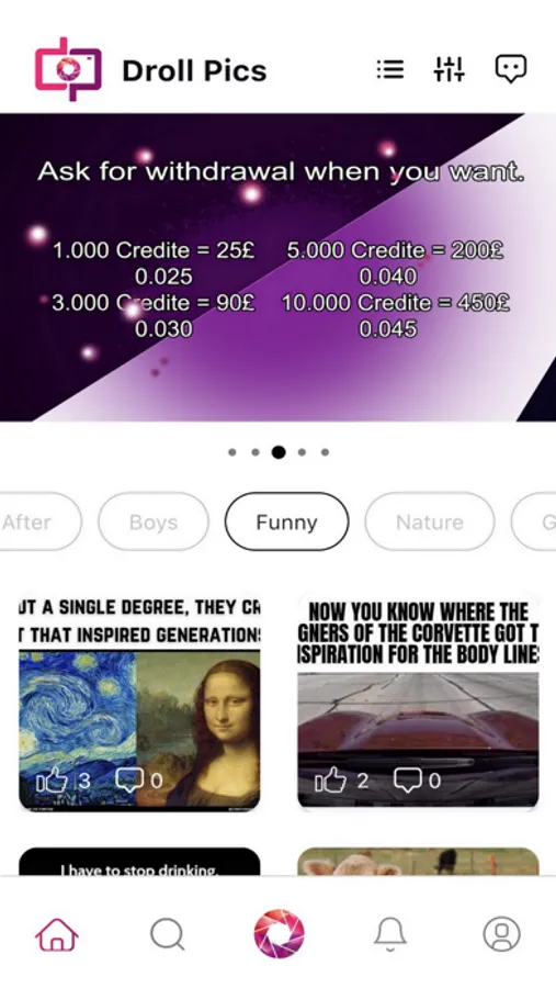 Sell your selfies with Droll Pics, a pay-per-view social media app. It's where you can sell your photos online, and can be a great way to earn some extra cash.