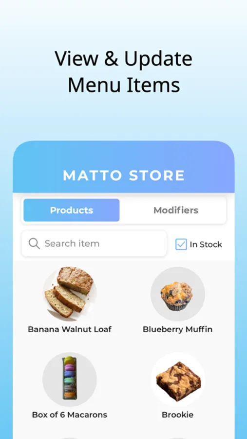 • Update menu items and their modifiers as in-stock and out-of-stock