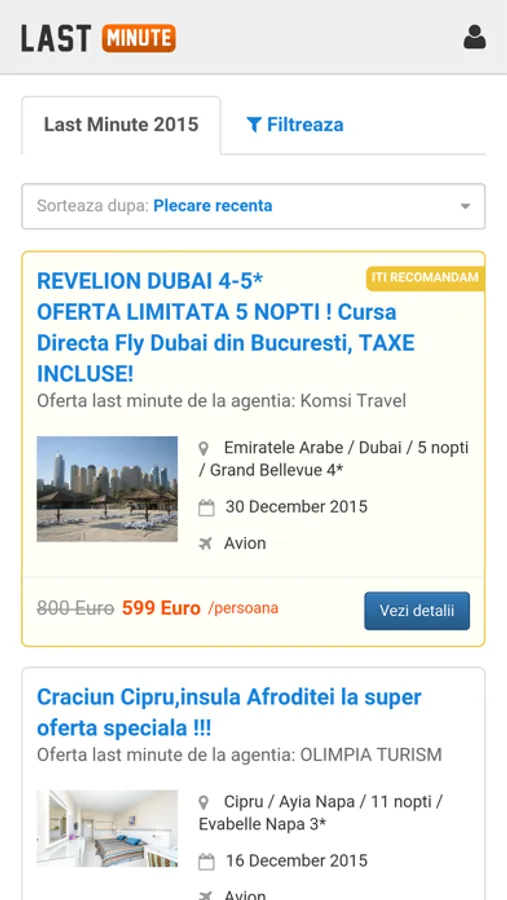 - Sortarea permite aranjarea ofertelor in functie de: data plecarii, ordinea crescatoare a preturilor.